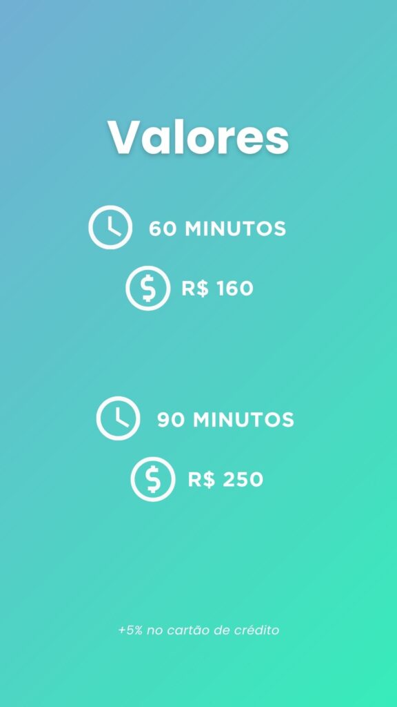 Para garantir seu horário no primeiro atendimento, é necessário o pagamento de R$ 50 como sinal. Envie o comprovante por mensagem para bloco da sessão. Esse valor será abatido do pagamento total da sessão.